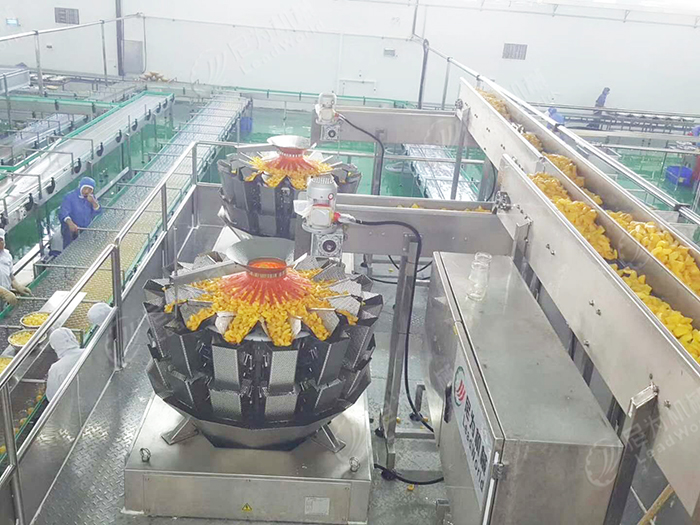 (2)按主機(jī)能力配置不同規(guī)模的連續(xù)化生產(chǎn)線。故蘿生產(chǎn)線視四道機(jī)(去皮、切端、通芯、括肉)的能力80個(gè)/min機(jī)分級(jí)規(guī)格進(jìn)行配置。桃子生產(chǎn)線視桃瓣挖核機(jī)的能力70~80個(gè)/min及分級(jí)規(guī)格進(jìn)行配置。火腿生產(chǎn)線能力750kg、1000kg1500kg、2000kg進(jìn)行配置。