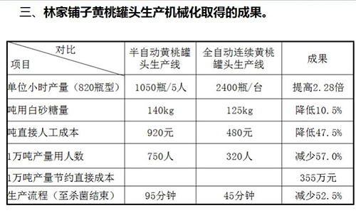 林家鋪?zhàn)狱S桃罐頭生產(chǎn)機(jī)械化取得的成果如下表(以下圖片由林家鋪?zhàn)?010年當(dāng)年采購(gòu)使用后做的對(duì)照表):