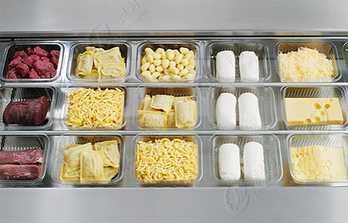 3.投料區(qū)。拉伸膜被拉伸成型之后,運行到投料區(qū)。填裝物料時,企業(yè)可自行選擇人工裝填或機(jī)械填裝。椰棗、奶酪、果脯等顆粒固形物可選配容器式計量灌裝機(jī)灌裝,番茄醬、黃油等膏狀、液體可選配液體罐裝機(jī)進(jìn)行灌裝等。